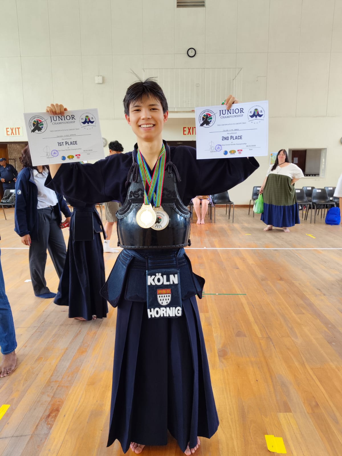 Unser Vereinsmitglied Julian ist gerade in Südafrika. Dort hatte er die Gelegenheit an der Südafrikanischen Jugendmeisterschaft teilzunehmen. Er hat dann im Einzel den zweiten Platz belegt und mit dem Team den ersten Platz.