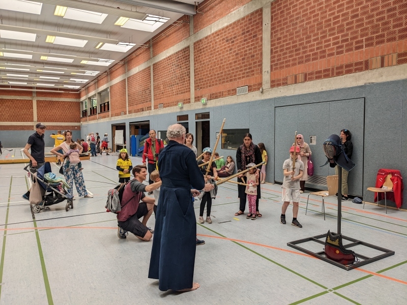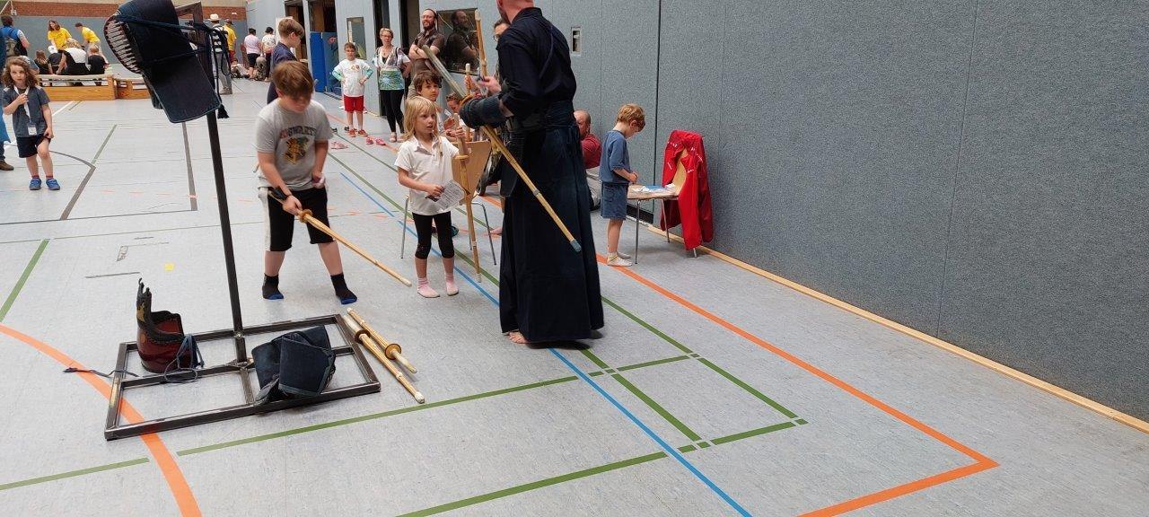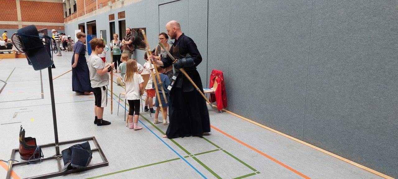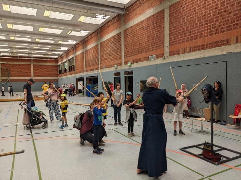 Letzen Samstag fand in Köln das Kindersportfest statt. Dort konnten sich die Kölner Sportvereine präsentieren und die vielen anwesenden Kinder konnten sich Sportarten anschauen und auch ausprobieren. So auch Kendo. Das Interesse war groß und unsere Jugendlichen und Trainer kamen aus dem erklären und vormachen gar nicht mehr heraus.